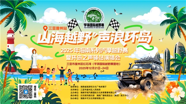 为深入贯彻落实党的二十大精神及习近平总书记关于体育工作的重要论述精神,积极响应《全民健身计划(2021-2025年)》与《海南省全民健身实施计划(2022-2025年)》的号召,推动海南自由贸易港、国际旅游消费中心及国家体育旅游示范区建设,助力“体育+文旅+文化”深度融合,由海南省旅游和文化广电体育厅指导,三亚市崖州区人民政府支持,海南宇琪汽摩国际文化体育赛事有限公司主办,乐东南玛俱乐部联合海南广播电视总台(集团)旅文中心承办的“山海越野・声浪环岛”2025年海南系列汽摩越野赛(三亚崖州站)暨环岛之声驿站演唱会活动,将于2025年12月21日至24日在三亚崖州区正式举办。