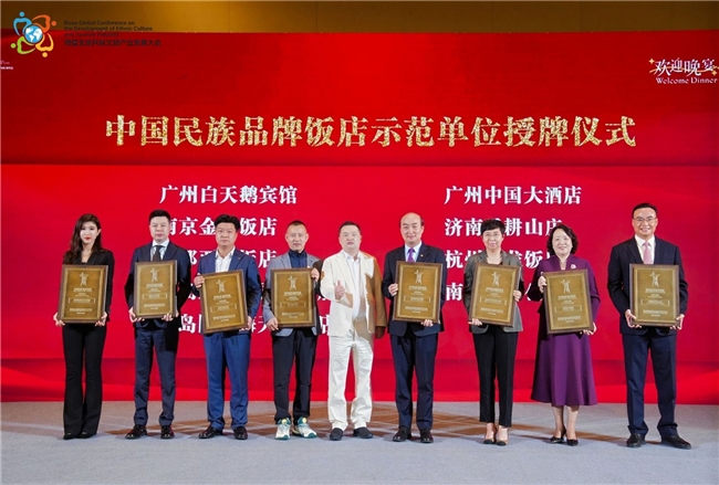 10 月25 日晚,大会颁奖盛典将活动推向高潮。盛典伊始,广州白天鹅宾馆、成都金牛宾馆、南京金陵饭店、青岛海景花园大酒店获授首批“民族品牌一中国服务实训基地”牌匾,为民族服务品牌搭建实践孵化平台,树立行业服务典范。