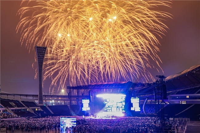 当晚,Katy Perry身着标志性活力装束惊艳登场。《Roar》《Teenage Dream》《Firework》等多首公告牌冠军金曲轮番唱响,熟悉的旋律瞬间唤醒全场共鸣,掀起万人大合唱热潮,当《Firework》的旋律响起之际,体育场上空绚烂烟花腾空绽放,与椰城静谧的夜空交相辉映,瞬间将现场氛围推向燃情顶峰。