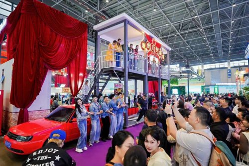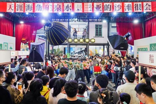五指山馆以红色为主色调,打造全景沉浸式演艺街区,将1988年海南特区初启时的老州府风貌完整搬入展馆。入口拱门融合传统与现代元素,通什农贸市场复刻区、老式电视机与红色老爷车相映成趣,外侧的“通什照相馆”“通什音像店”“南圣河影剧院”等复古场景,搭配怀旧金曲与年代标语,瞬间拉满时光氛围感。每一处细节都浸润着老州府的烟火气与闯劲,让参观者在穿越感中感受时代变迁,呼应海南建省与自贸港封关两大历史节点的精神传承,也为产品展销营造了独特的情感共鸣场景。