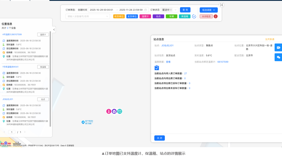 此次更新中,SCMsafe链四方在订单地图中持续强化运输过程的实时呈现能力,不仅新增温度计详情展示,还进一步丰富了保温箱、站点等关键节点信息,并支持订单跟踪与设备定位的自动刷新。